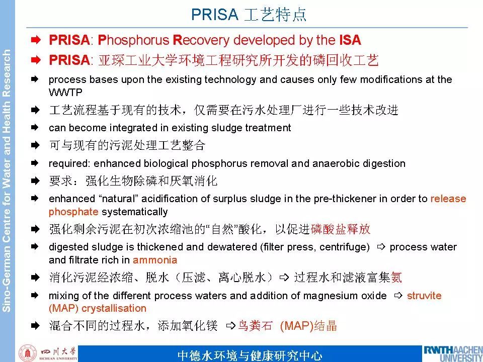 PRISA工藝是從污泥處理過程中產生的工藝水中回收磷(一次濃縮池上清液、厭氧消化池上清液、二次濃縮池上清液)。這三種工藝水中含磷的形態不一樣。經過一定的化學處理之后,回收到是大家都非常熟悉的MAP。該回收工藝基于現有的污水處理工藝,僅需要在污水處理廠進行一些技術改進,與現有的污泥處理工藝整合。該回收工藝對污水處理工藝要求,必須采用強化生物除磷工藝,否則污泥處理過程的工藝水中的磷的含量就比較低,就不太適合PRISA回收工藝。磷回收率要大于50%,滿足德國新"污泥條例"對于磷回收率的要求。